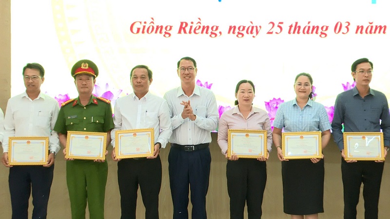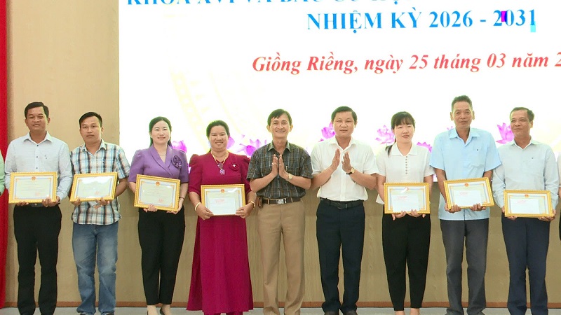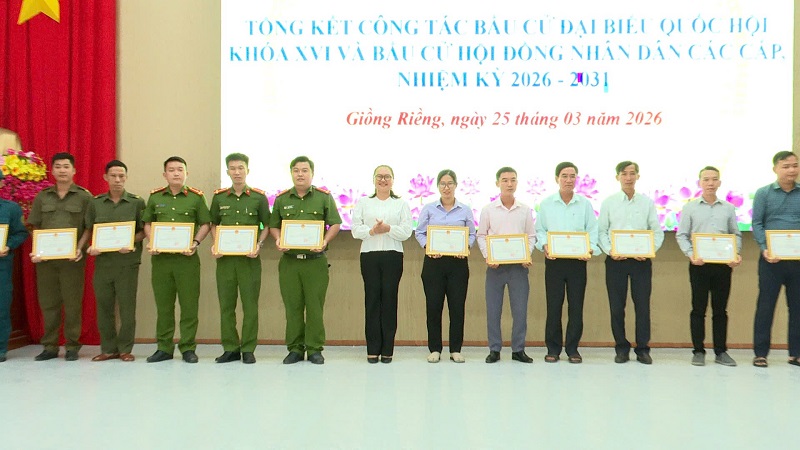 Dịp này, UBND xã Giồng Riềng đã trao giấy khen cho 16 tập thể và 129 cá nhân có thành tích tốt trong trong công tác bầu cử đại biểu Quốc hội khóa XVI và HĐND các cấp nhiệm kỳ 2026–2031, nhằm ghi nhận và động viên kịp thời những đóng góp tích cực, góp phần vào thành công chung của cuộc bầu cử trên địa bàn xã.